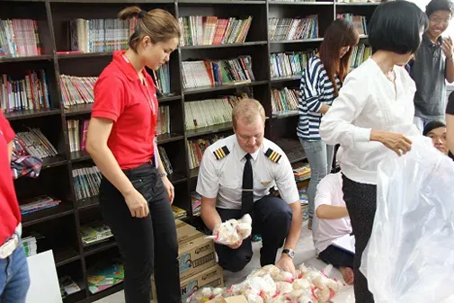 Chị Huỳnh Thị Thu Hương - Ancillary Project Manager và anh Jacob Thomsen (VietJet FO) đang chuẩn bị quà tặng cho các bé.