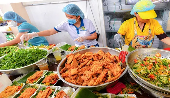 Mỗi ngày 20.000 phần cơm chay và mặn miễn phí được chương trình "Bữa cơm yêu thương" chuyển đến bác sĩ ở các bệnh viện dã chiến, khu cách ly, những hoàn cảnh nghèo khó.