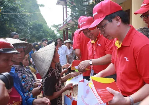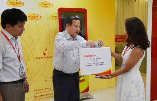 Lãnh đạo Vietjet và đoàn cứu trợ chia sẻ quà tặng cho người dân Quảng Bình